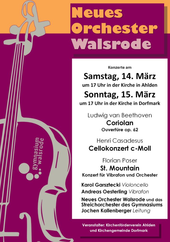 Das Streichorchester und das Neue Orchester Walsrode spielen im März zwei Konzerte und reisen dabei an die beiden Ränder des Einzugsgebietes unserer Schule: Am Samstag, den 14. März in Ahlden und am Sonntag, den 15. März in Dorfmark, jeweils um 17 Uhr.